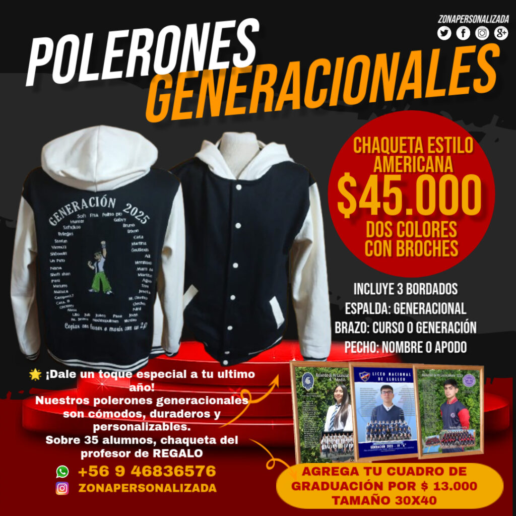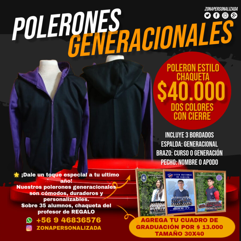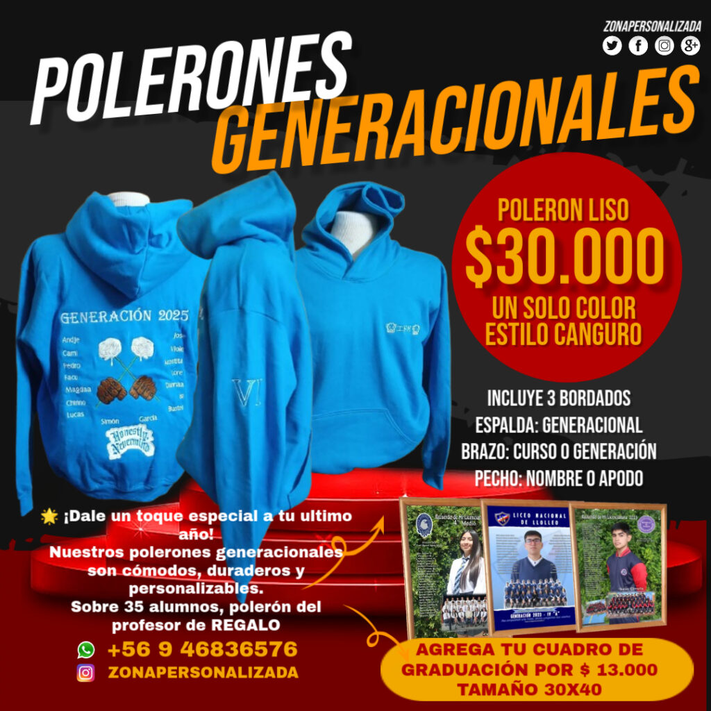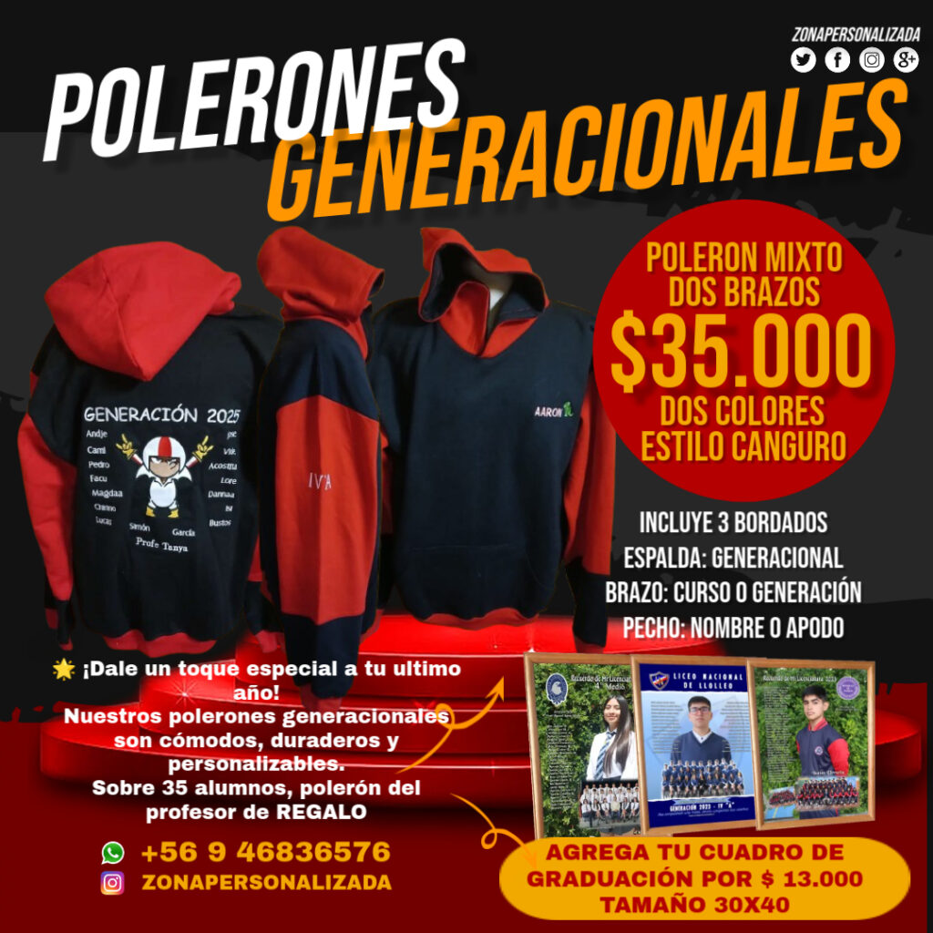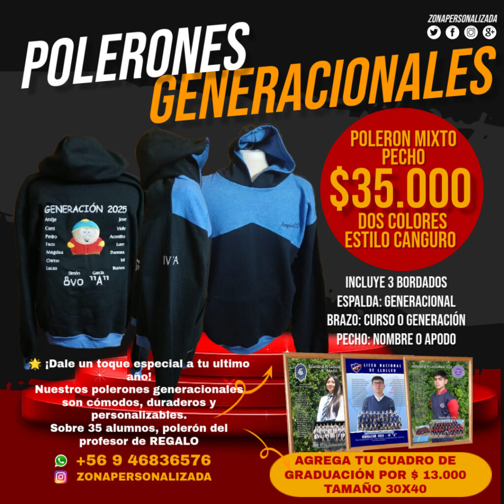 Este año 2026 traemos la mejor calidad en Polerones Generacionales para Kínder, Octavos Básicos, y Cuartos Medios, con diferentes tallas, modelos y colores, precios variables y además ofrecemos un descuento en cuadros de licenciatura 2026 si realizas con nosotros tus polerones.